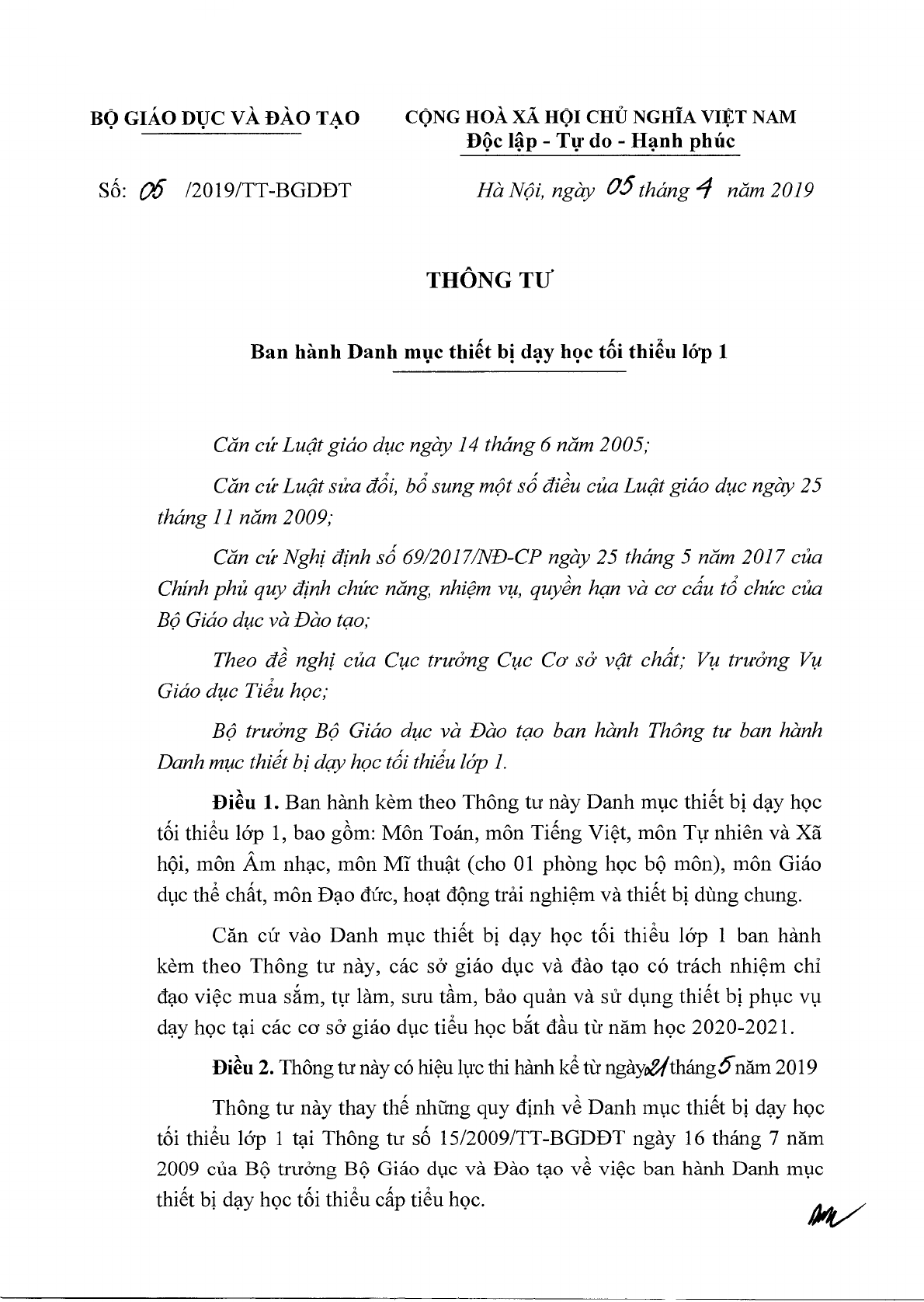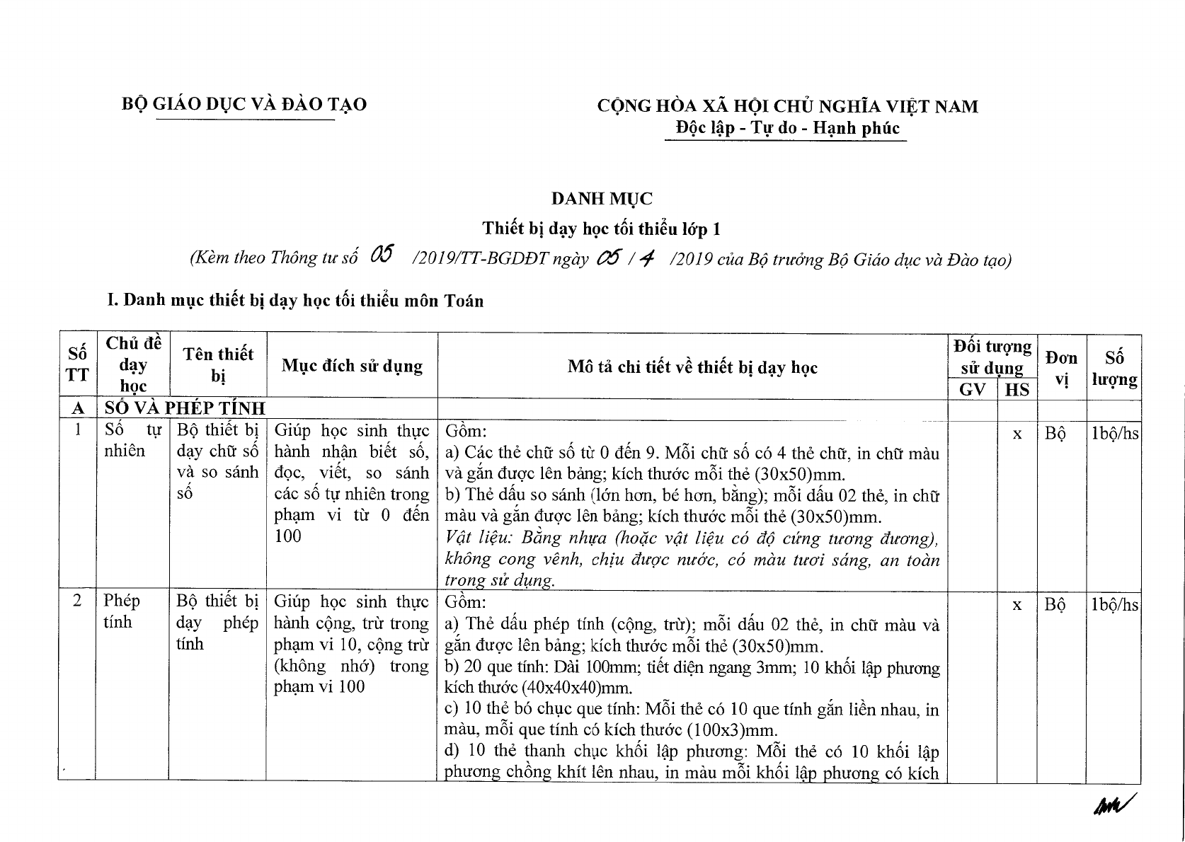 Thông tư 05/2019/TT-BGDĐT của Bộ Giáo dục và Đào tạo về việc ban hành Danh mục thiết bị dạy học tối thiểu lớp 1.