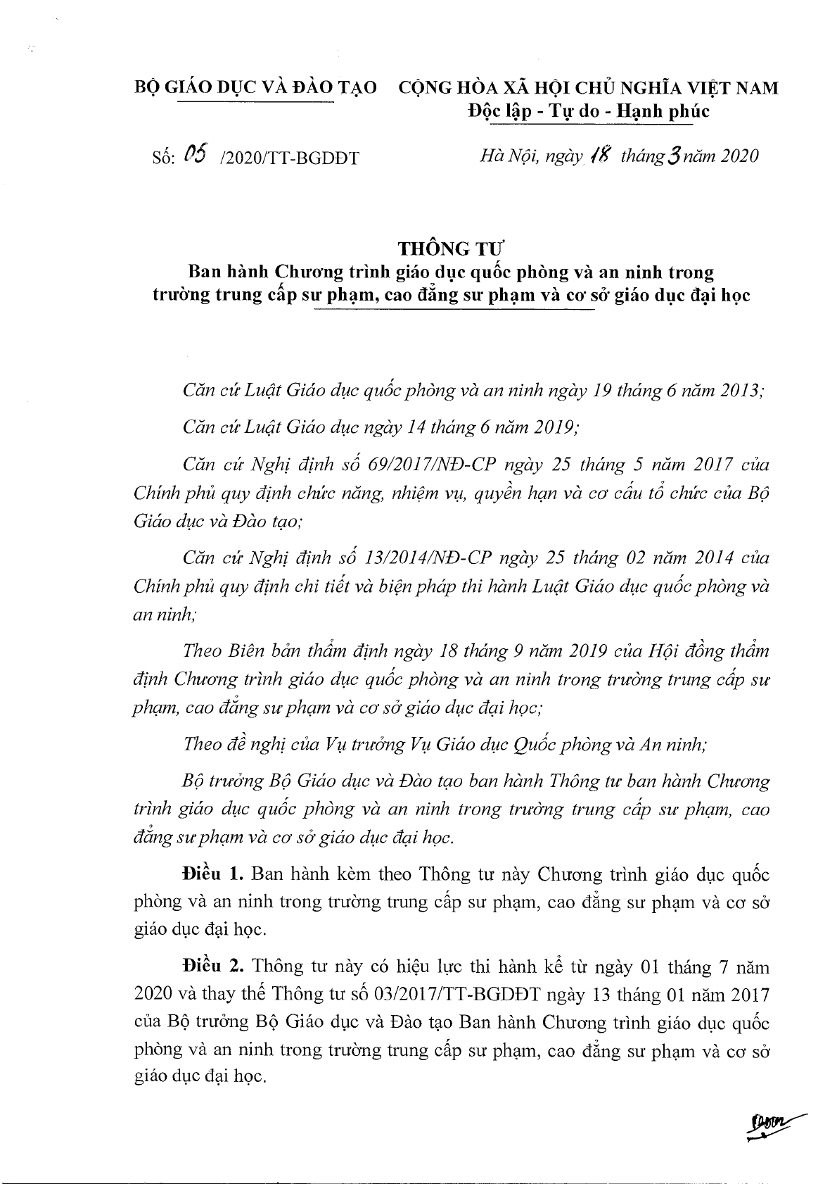 Ngày 18/3/2020, Bộ Giáo dục và Đào tạo ra Thông tư 05/2020/TT-BGDĐT về việc ban hành Chương trình giáo dục quốc phòng và an ninh trong trường trung cấp sư phạm, cao đẳng sư phạm và cơ sở giáo dục đại học.
