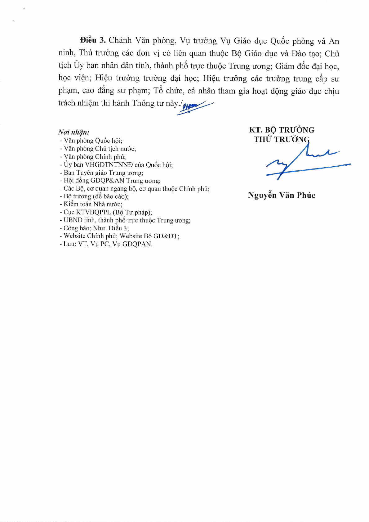 Thông tư này bắt đầu có hiệu lực từ ngày 1/7/2020 và thay thế cho Thông tư 03/2017/TT-BGDĐT của Bộ giáo dục đào tạo về ban hành Chương trình giáo dục quốc phòng và an ninh trong trường trung cấp sư phạm, cao đẳng sư phạm và các cơ sở giáo dục đại học.