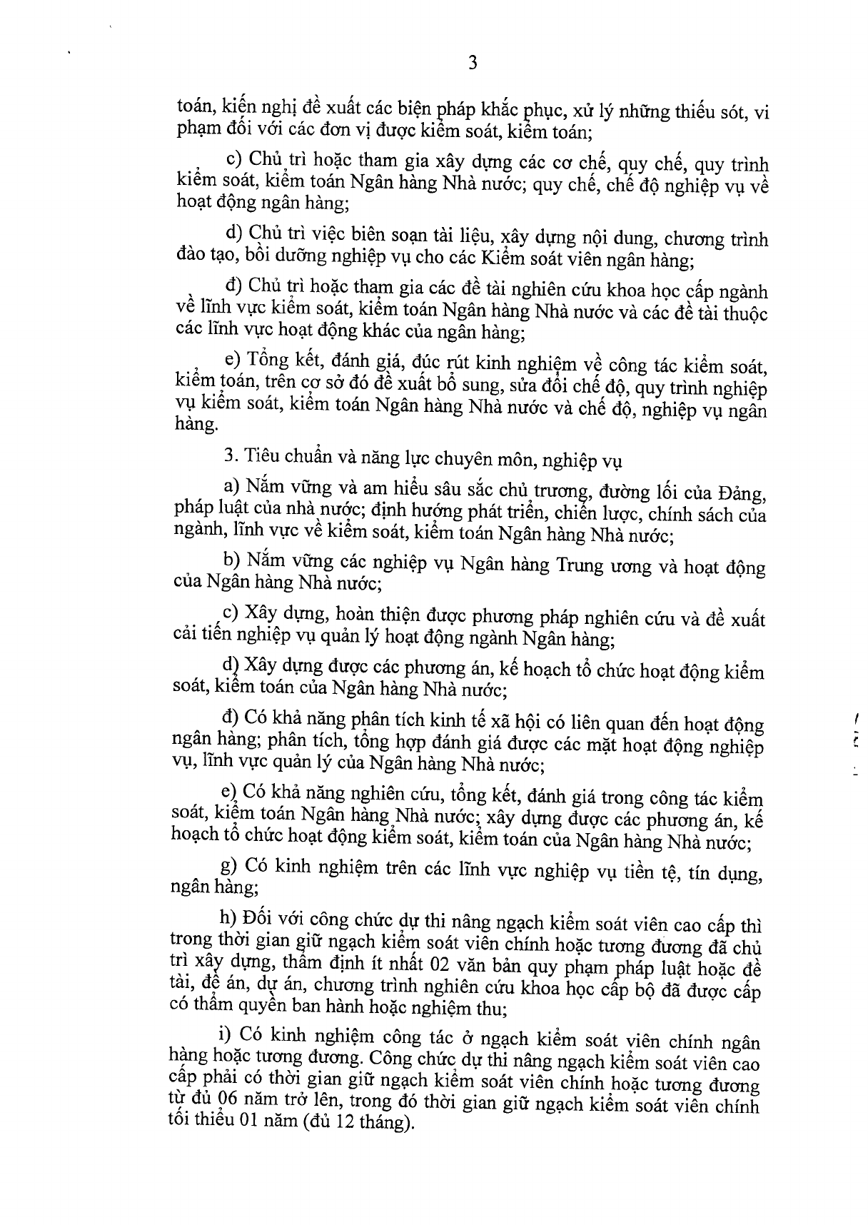 Theo đó, Kiểm soát viên chính ngân hàng phải có Chứng chỉ ngoại ngữ trình độ tương đương bậc 3 khung năng lực ngoại ngữ Việt Nam. Ngoài ra, Kiểm soát viên chính ngân hàng cũng cần có: Bằng tốt nghiệp đại học trở lên thuộc một trong các chuyên ngành kinh tế, tài chính, ngân hàng, kiểm toán, kế toán; Chứng chỉ bồi dưỡng nghiệp vụ quản lý Nhà nước ngạch Chuyên viên chính; Chứng chỉ tin học…