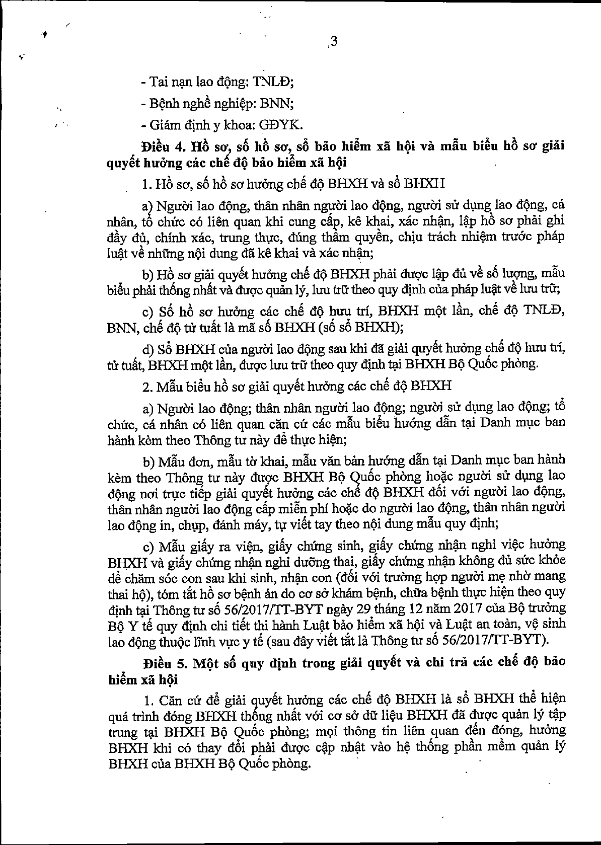 Theo đó, Thông tư này hướng dẫn về hồ sơ, quy trình và trách nhiệm của cơ quan, đơn vị, tổ chức và cá nhân có liên quan trong việc giải quyết hưởng các chế độ bảo hiểm xã hội: Ốm đau; thai sản; tai nạn lao động, bệnh nghề nghiệp; hưu trí và tử tuất trong Bộ Quốc phòng.