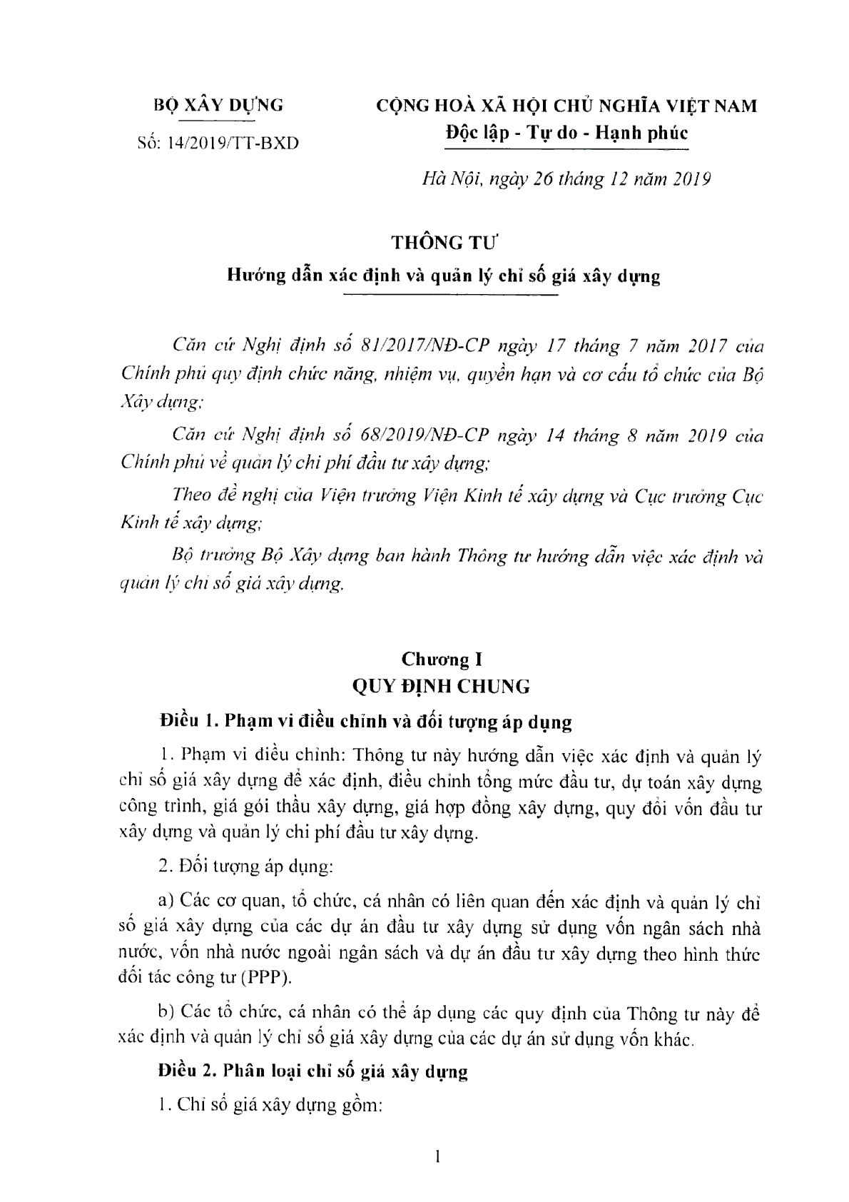Thông tư 14/2019/TT-BXD của Bộ Xây dựng về việc hướng dẫn xác định và quản lý chỉ số giá xây dựng.