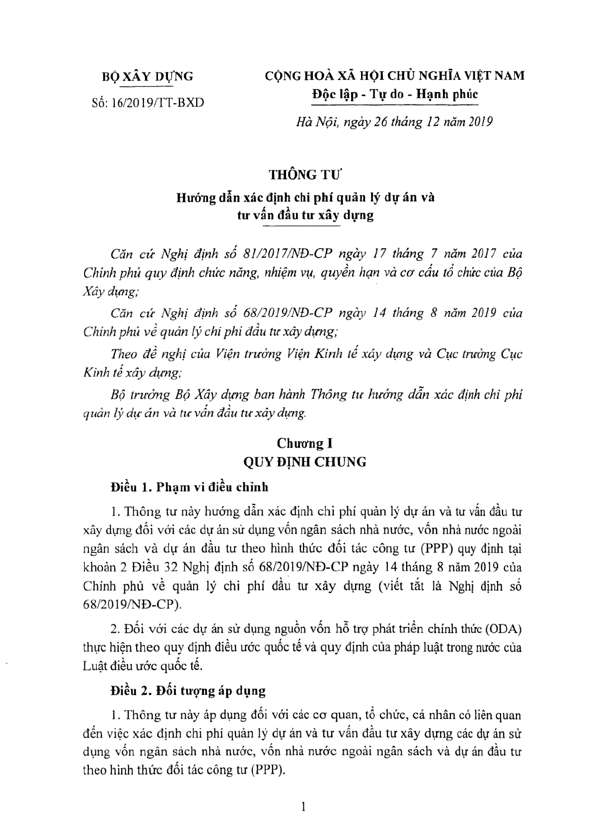 Thông tư 16/2019/TT-BXD - Xác định chi phí quản lý dự án và tư vấn đầu tư xây dựng