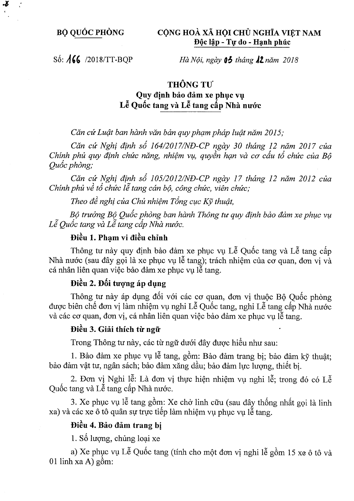 Thông tư 166/2018/TT-BQP quy định về bảo đảm xe phục vụ lễ quốc tang và lễ tang cấp nhà nước do Bộ trưởng Bộ quốc phòng ban hành.