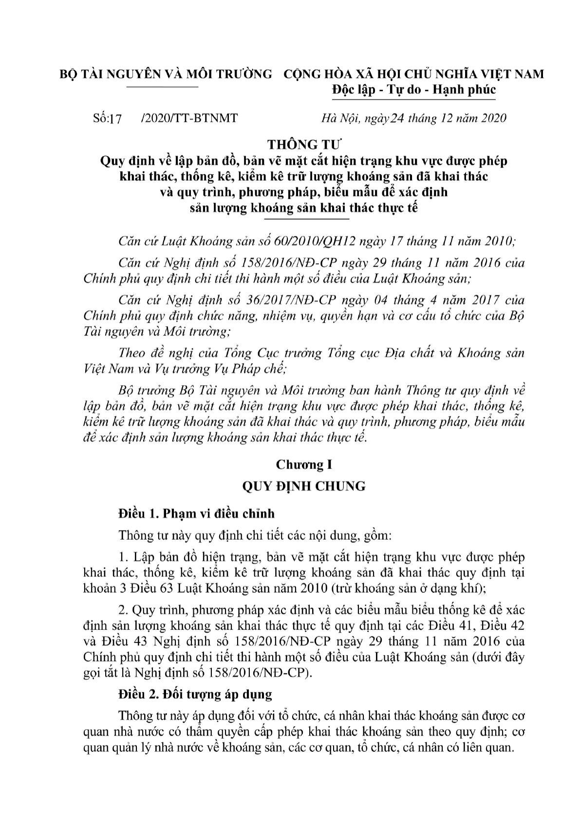 Thông tư 17/2020/TT-BTNMT của Bộ Tài nguyên và Môi trường quy định về lập bản đồ, bản vẽ mặt cắt hiện trạng khu vực được phép khai thác, thống kê, kiểm kê trữ lượng khoáng sản đã khai thác và quy trình, phương pháp, biểu mẫu để xác định sản lượng khoáng sản khai thác thực tế.