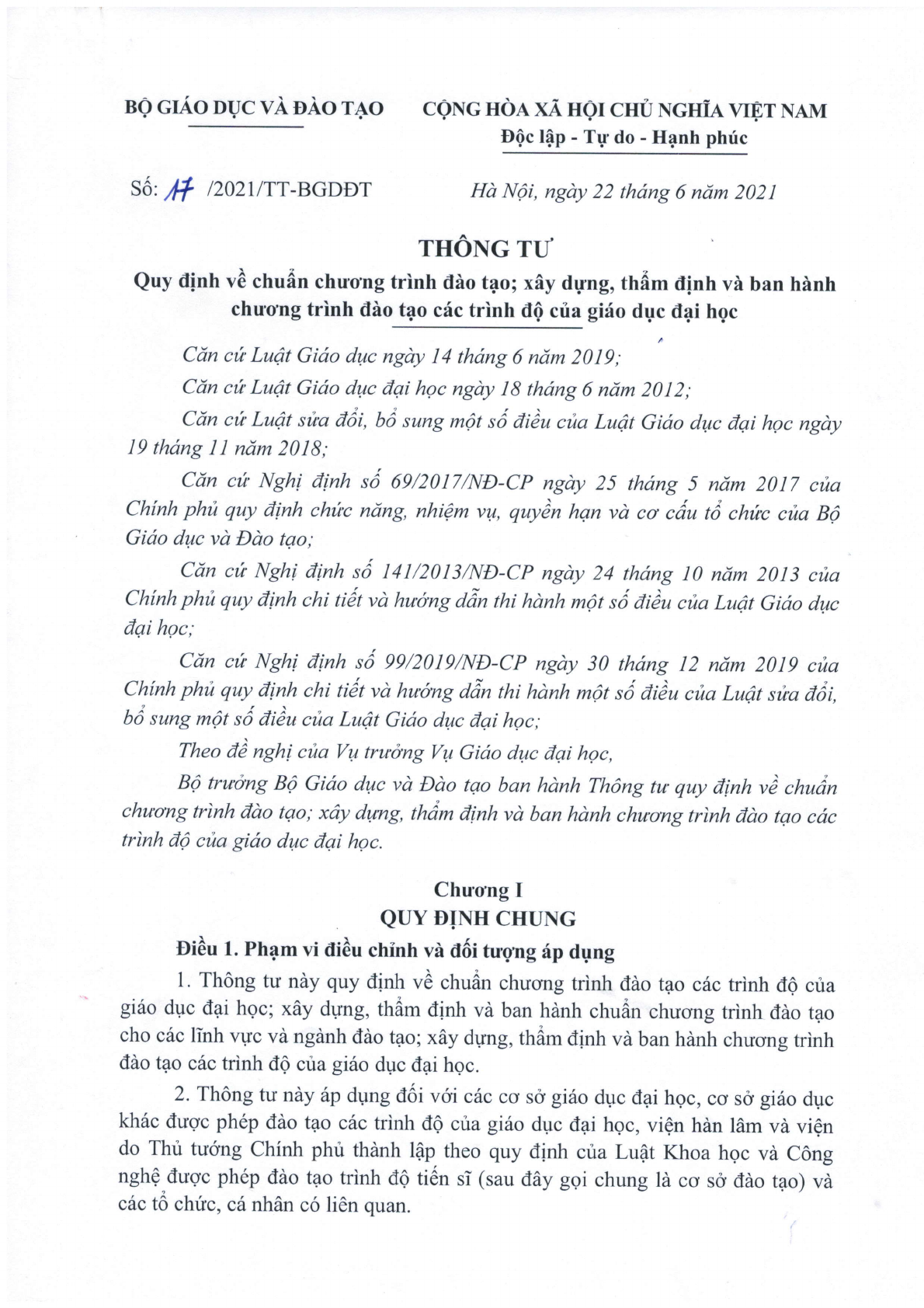 Thông tư 17/2021/TT-BGDĐT của Bộ Giáo dục và Đào tạo quy định về chuẩn chương trình đào tạo; xây dựng, thẩm định và ban hành chương trình đào tạo các trình độ của giáo dục đại học.