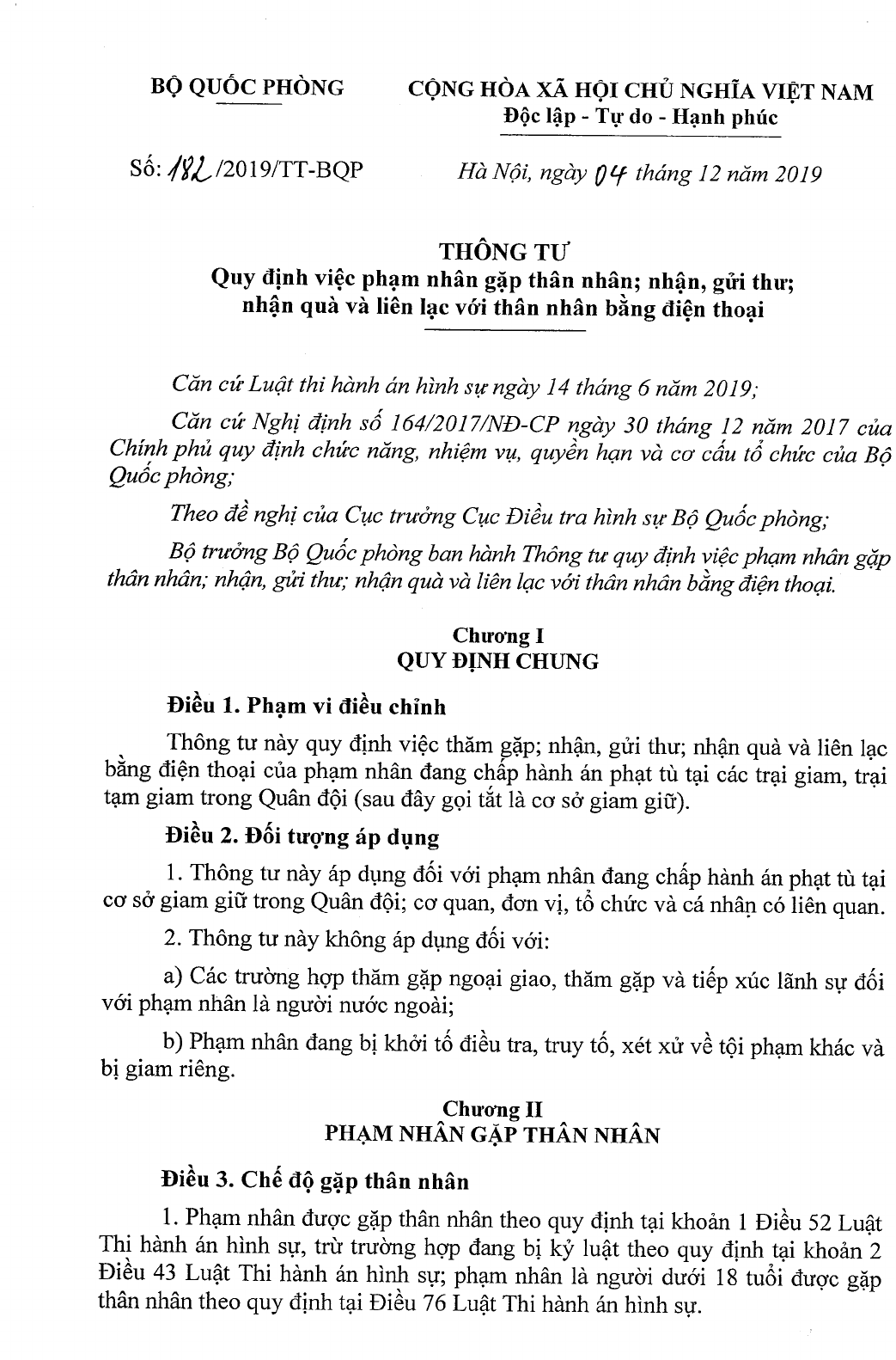 Thông tư 182/2019/TT-BQP quy định về việc phạm nhân gặp thân nhân; nhận, gửi thư, nhận quà và liên lạc với thân nhân bằng điện thoại do bộ trưởng bộ quốc phòng ban hành.