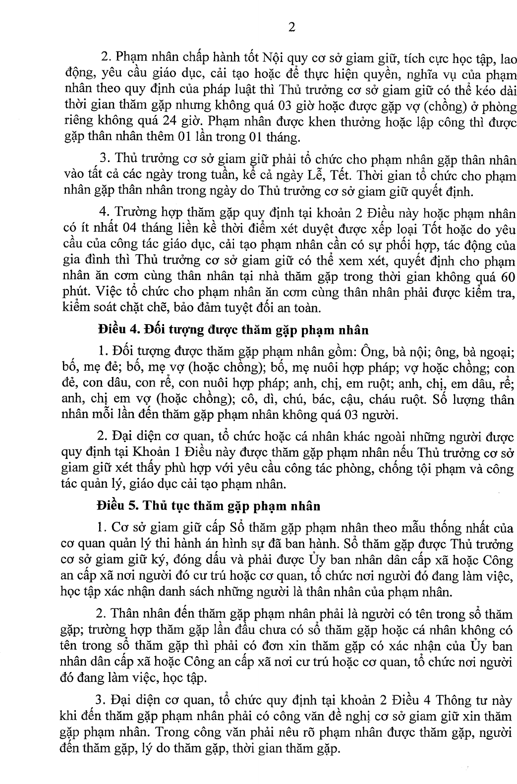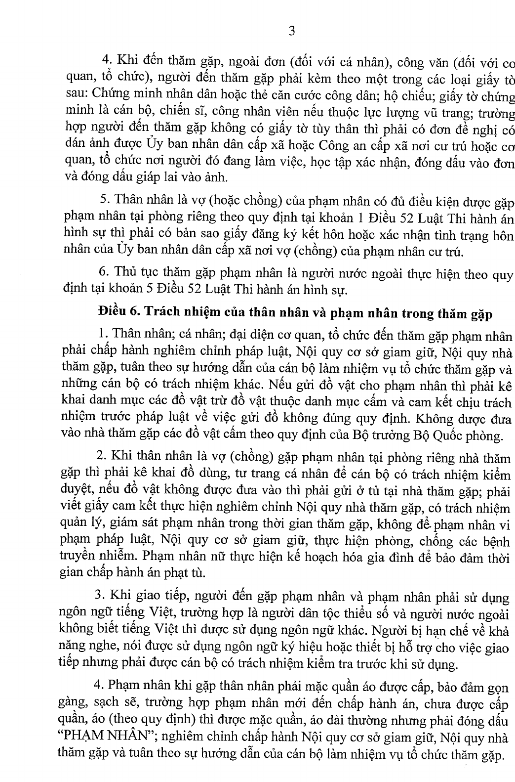 Ngày 4/12/2019 Bộ quốc phòng ban hành thông tư quy định về việc phạm nhân gặp thân nhân; nhận, gửi thư, nhận quà và liên lạc với thân nhân bằng điện thoại đối với các phạm nhân đang chấp hành án phạt tù tại các trại giam, trại tạm giam trong Quân đội.