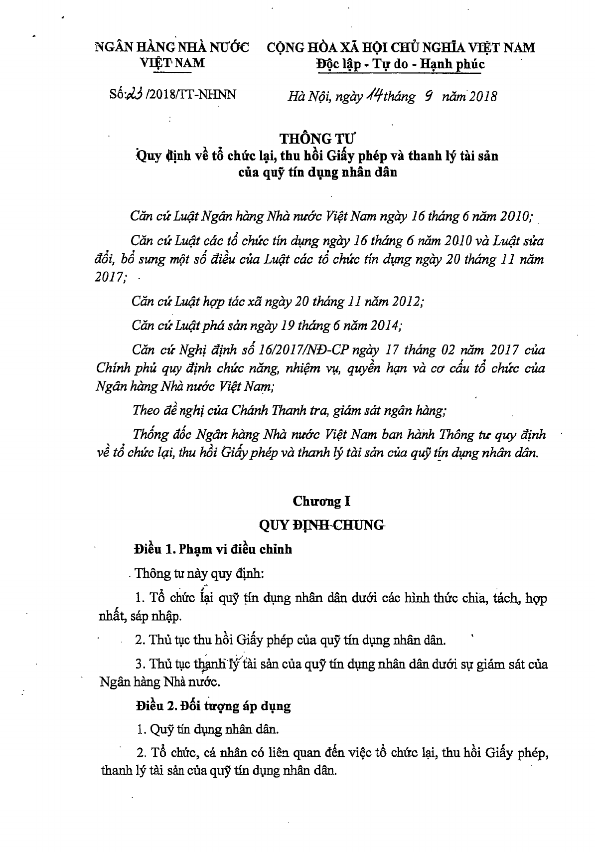 Thông tư 23/2018/TT-NHNN của Ngân hàng Nhà nước Việt Nam quy định về tổ chức lại, thu hồi Giấy phép và thanh lý tài sản của quỹ tín dụng nhân dân.