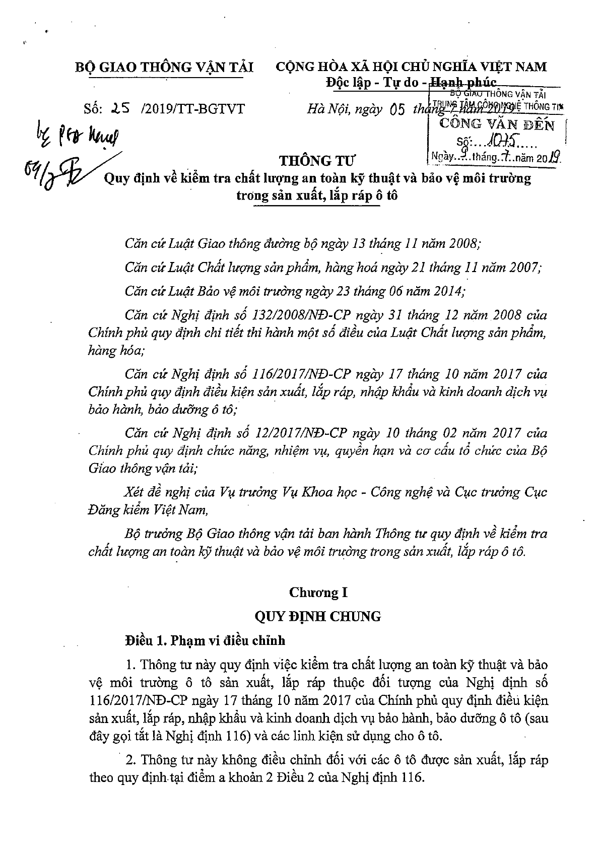 Bộ Giao thông Vận tải đã ban hành Thông tư 25/2019/TT-BGTVT quy định về kiểm tra chất lượng an toàn kỹ thuật và bảo vệ môi trường trong sản xuất, lắp ráp ô tô ngày 05/7/2019, có hiệu lực từ ngày 25/8/2019.