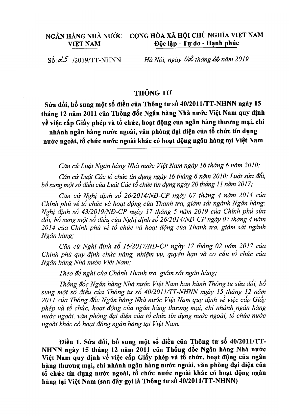 Ngày 02/12/2019, Ngân hàng Nhà nước Việt Nam ban hành Thông tư 25/2019/TT-NHNN về việc sửa đổi, bổ sung một số điều của Thông tư 40/2011/TT-NHNN ngày 15/12/2011 của Thống đốc Ngân hàng Nhà nước Việt Nam quy định về việc cấp Giấy phép và tổ chức, hoạt động của ngân hàng thương mại, chi nhánh ngân hàng nước ngoài, văn phòng đại diện của tổ chức tín dụng nước ngoài, tổ chức nước ngoài khác có hoạt động ngân hàng tại Việt Nam.