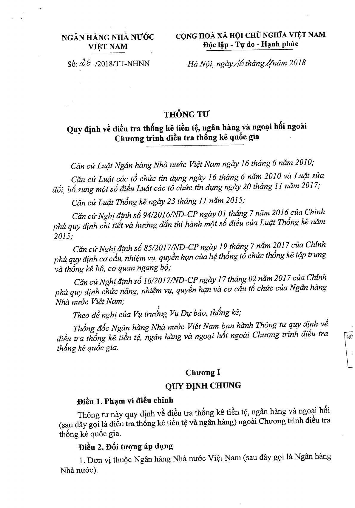 Thông tư 26/2018/TT-NHNN quy định về điều tra thống kê tiền tệ, ngân hàng và ngoại hối ngoài chương trình điều tra thống kê quốc gia do ngân hàng nhà nước Việt Nam ban hành.