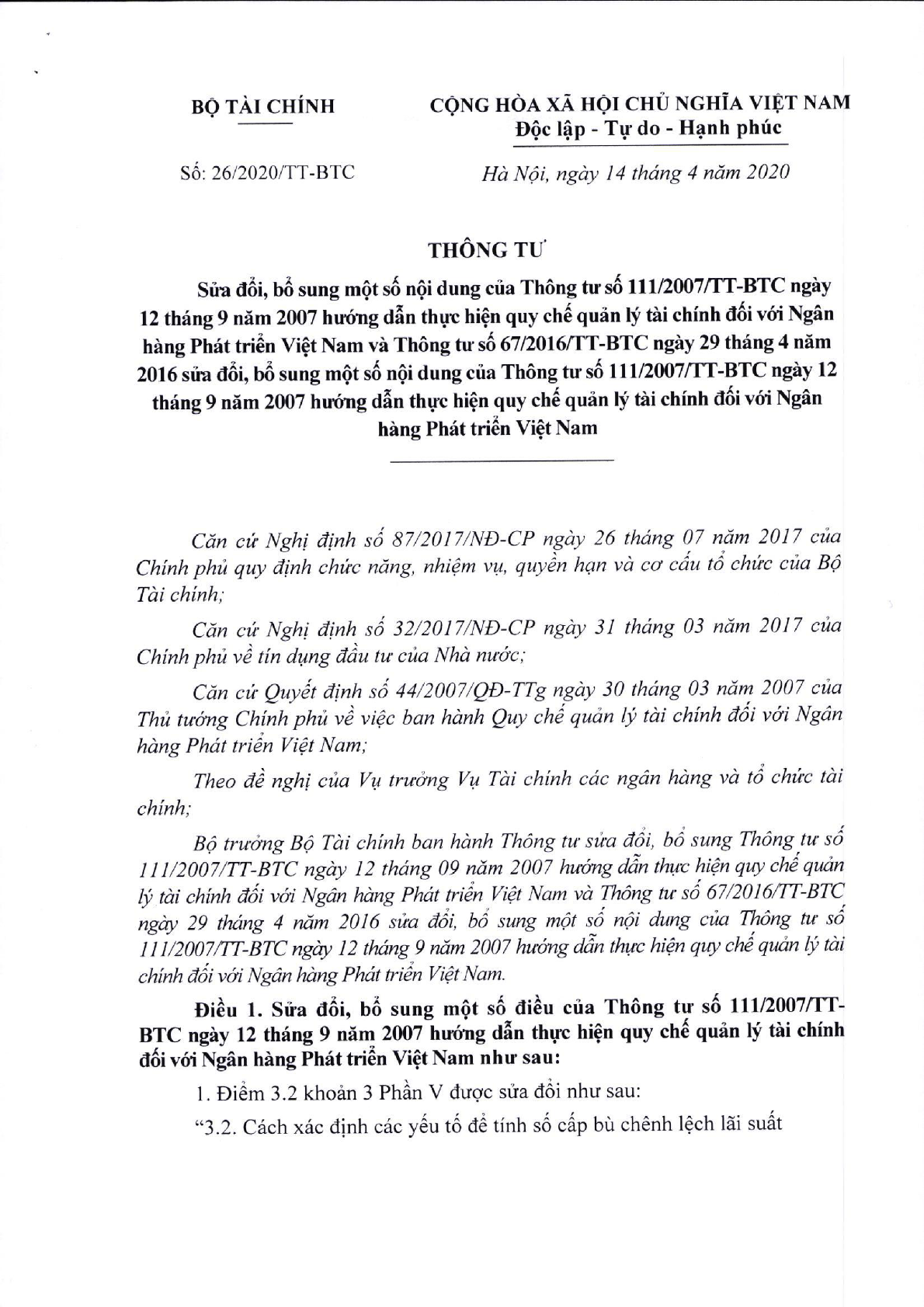 Ngày 14/4/2020, Bộ Tài chính đã ban hành Thông tư 26/2020/TT-BTC sửa đổi, bổ sung một số nội dung của Thông tư 111/2007/TT-BTC ngày 12/9/2007 hướng dẫn thực hiện quy chế quản lý tài chính đối với Ngân hàng Phát triển Việt Nam và Thông tư 67/2016/TT-BTC ngày 29/4/2016 sửa đổi, bổ sung một số nội dung của Thông tư 111/2007/TT-BTC ngày 12/9/2007 hướng dẫn thực hiện quy chế quản lý tài chính đối với Ngân hàng Phát triển Việt Nam.