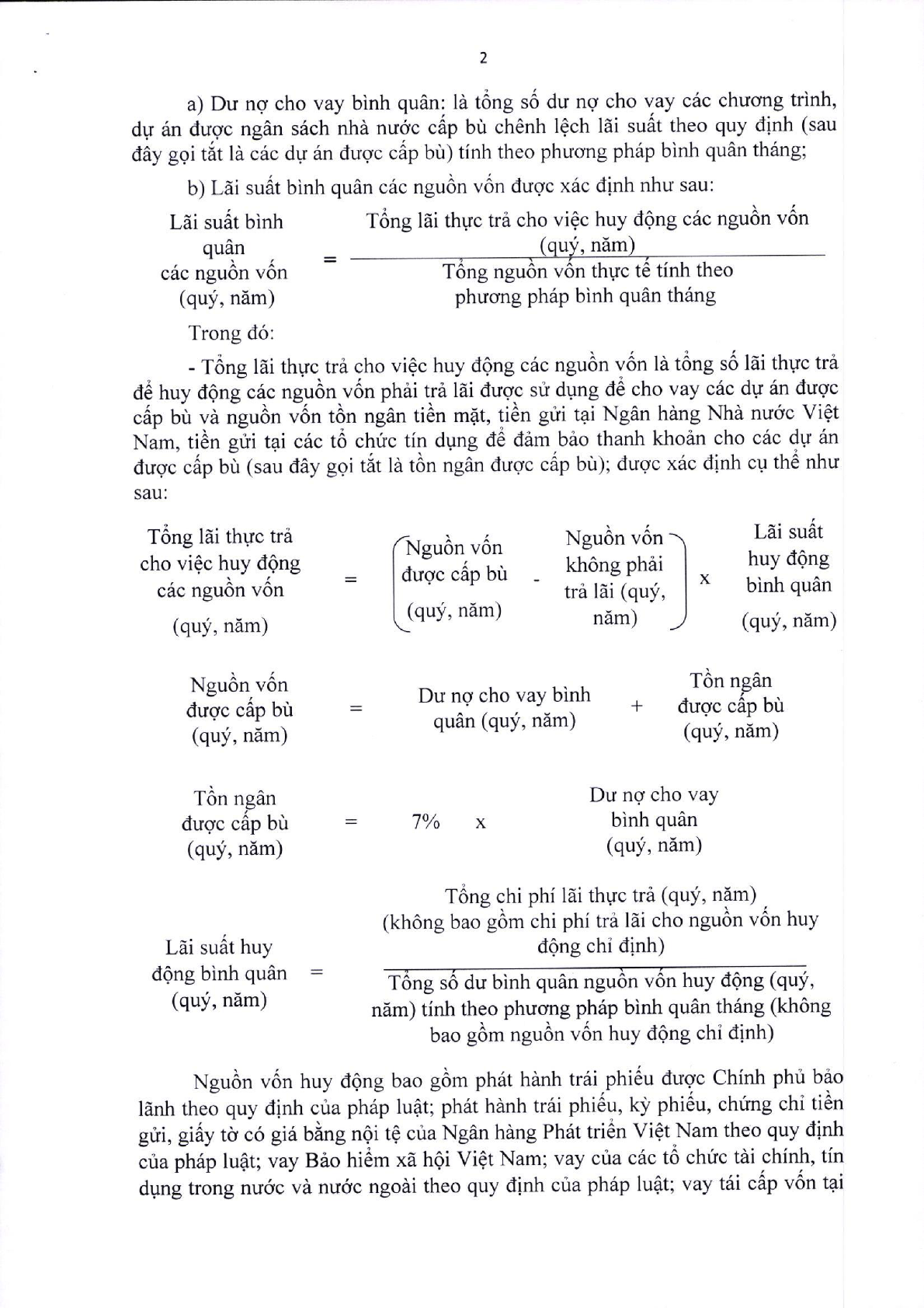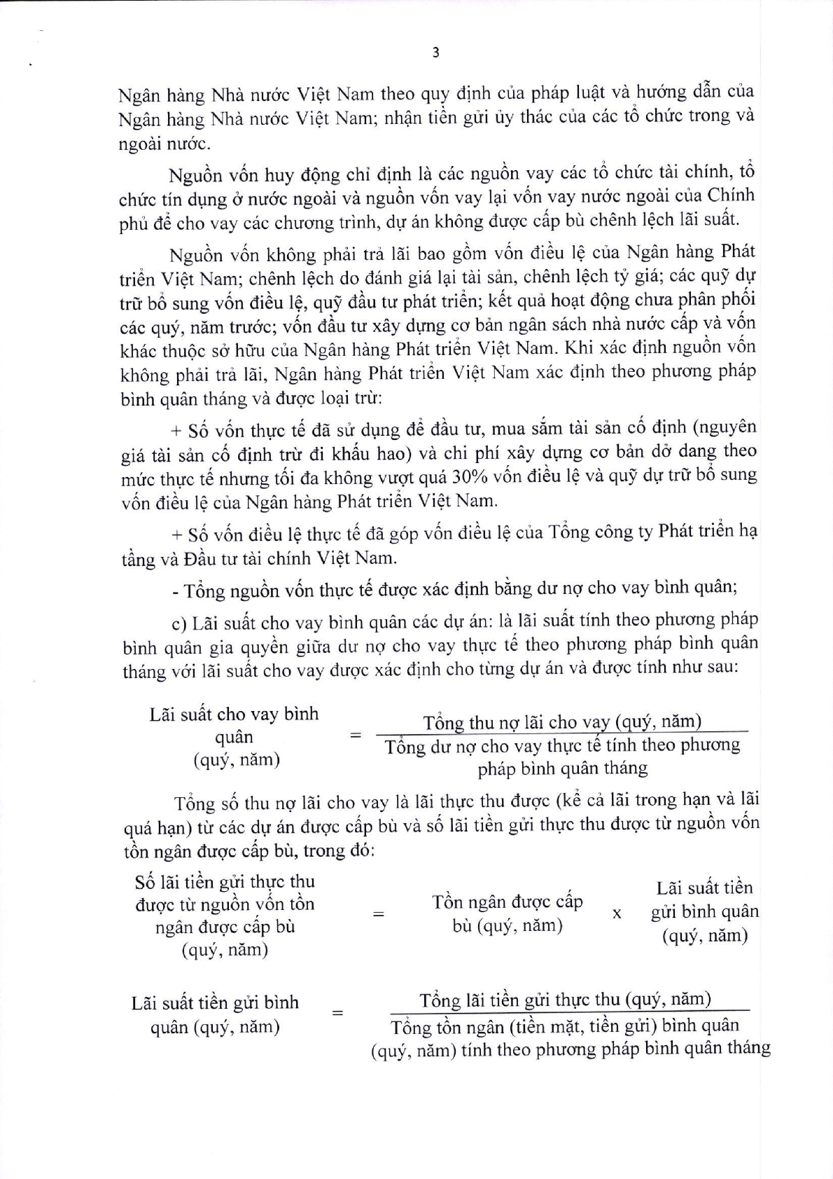 Khi xác định nguồn vốn không phải trả lãi, Ngân hàng Phát triển Việt Nam xác định theo phương pháp bình quân và được loại trừ: Số vốn thực tế đã sử dụng để đầu tư, mua sắm tài sản cố định và chi phí xây dựng cơ bản dở dang theo mức thực tế nhưng tối đa không quá 30% vốn điều lệ và quỹ dự trữ bổ sung vốn điều lệ của ngân hàng; số vốn điều lệ thực thế đã góp vốn điều lệ của Tổng công ty Phát triển hạ tầng và Đầu tư tài chính Việt Nam.