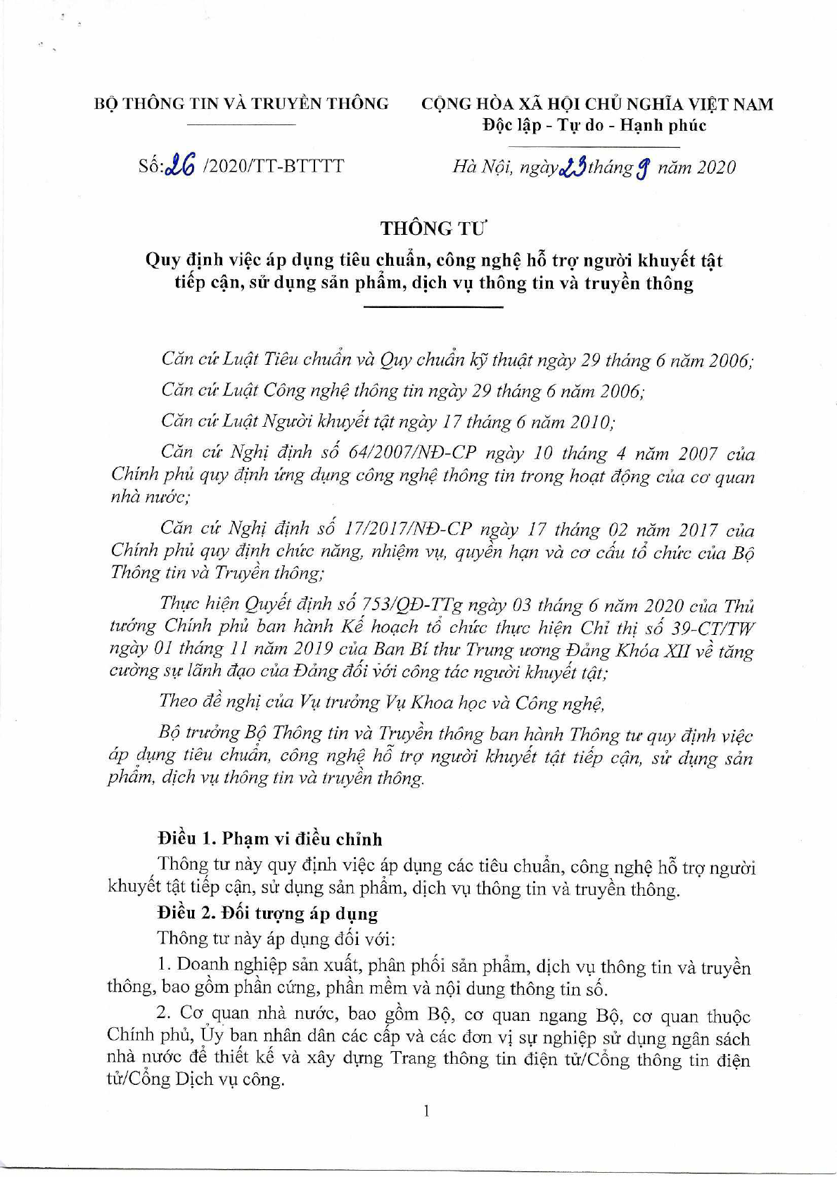 Thông tư 26/2020/TT-BTTTT của Bộ Thông tin và Truyền thông quy định việc áp dụng tiêu chuẩn, công nghệ hỗ trợ người khuyết tật tiếp cận, sử dụng sản phẩm, dịch vụ thông tin và truyền thông.