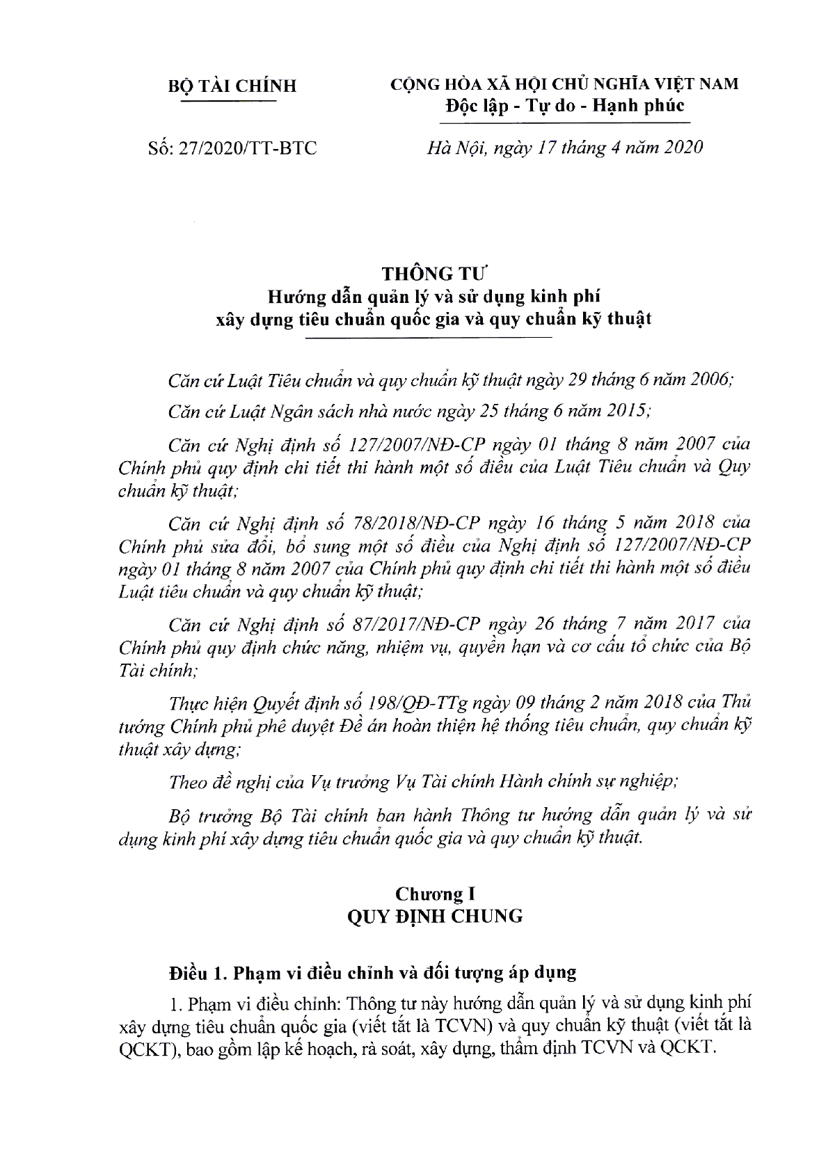 Ngày 17/4/2020, Bộ Tài chính ban hành Thông tư 27/2020/TT-BTC về việc hướng dẫn quản lý và sử dụng kinh phí xây dựng tiêu chuẩn quốc gia và quy chuẩn kỹ thuật.