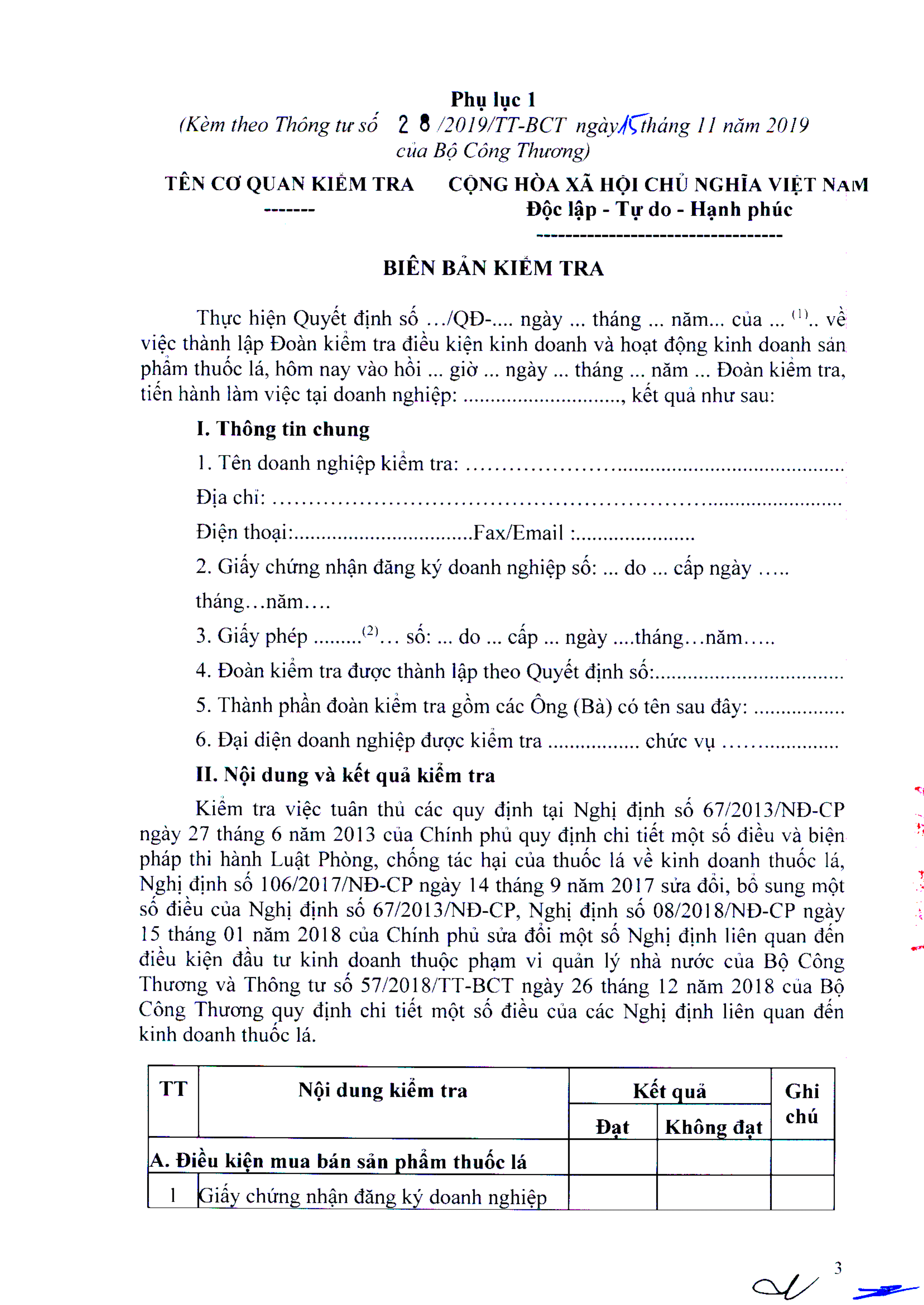 Thông tư 28/2019/TT-BCT của Bộ Công Thương về việc sửa đổi, bổ sung một số điều của Thông tư 57/2018/TT-BCT ngày 26/12/2018 của Bộ trưởng Bộ Công Thương quy định chi tiết một số điều của các Nghị định liên quan đến kinh doanh thuốc lá.