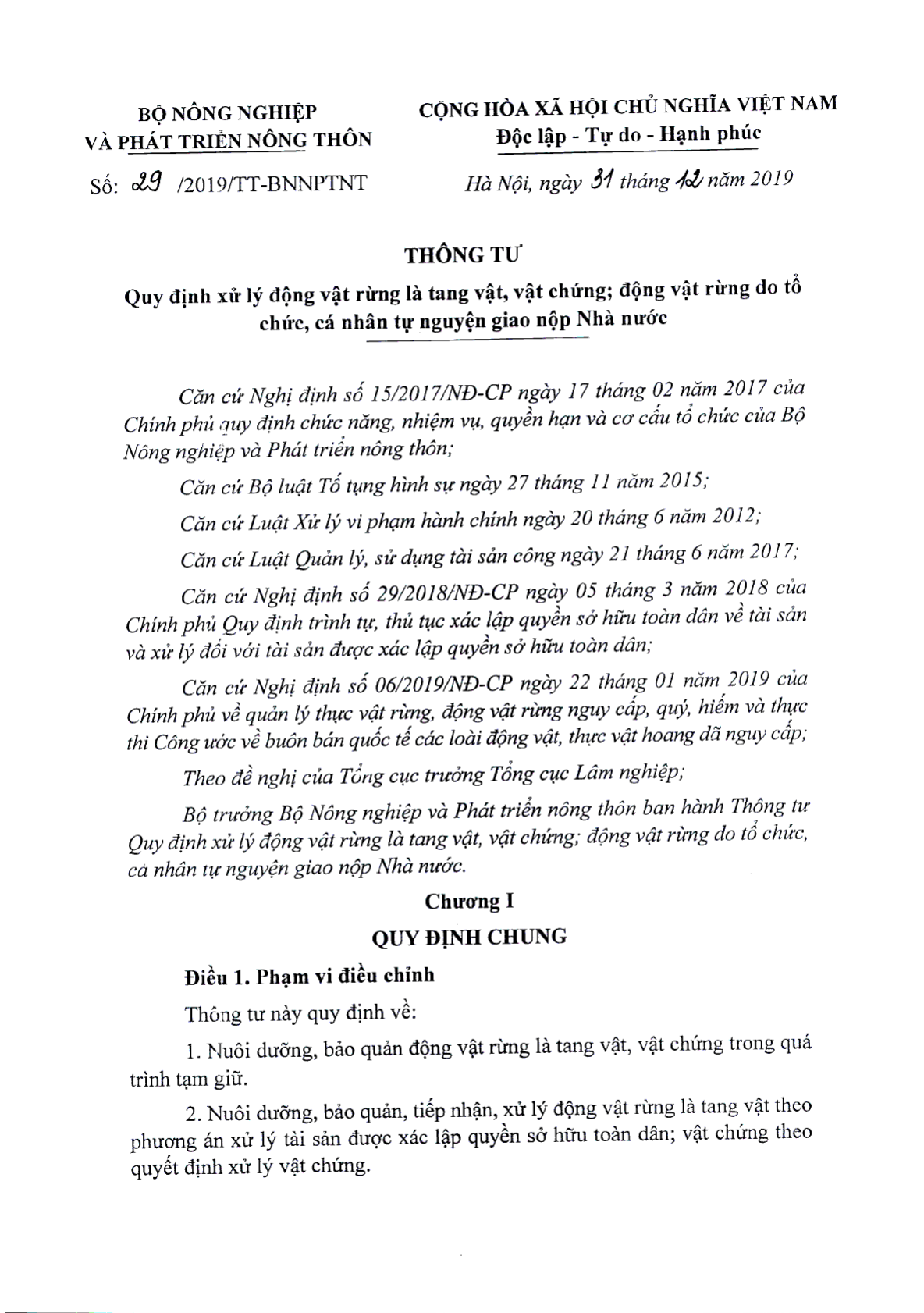 Bộ Nông nghiệp và Phát triển nông thôn đã ra Thông tư 29/2019/TT-BNNPTNT về việc quy định xử lý động vật rừng là tang vật, vật chứng; động vật rừng do tổ chức, cá nhân tự nguyện giao nộp Nhà nước ngày 31/12/2019.