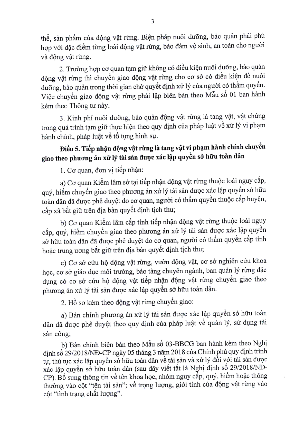 Theo đó, có 05 hình thức xử lý động vật rừng sau tiếp nhận như: Chuyển giao động vật rừng cho vườn động vật, cơ sở nghiên cứu khoa học, đào tạo, giáo dục môi trường, bảo tàng chuyên ngành; Bán động vật rừng;... Cụ thể: