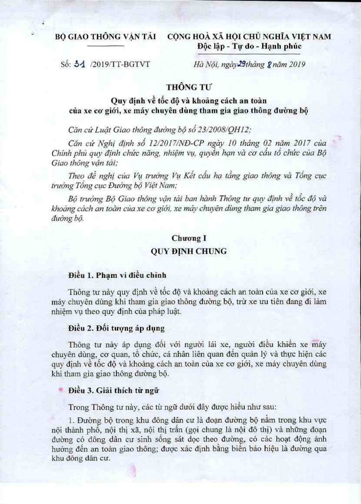 Thông tư 31/2019/TT-BGTVT của Bộ Giao thông Vận tải quy định về tốc độ và khoảng cách an toàn của xe cơ giới, xe máy chuyên dùng tham gia giao thông đường bộ.