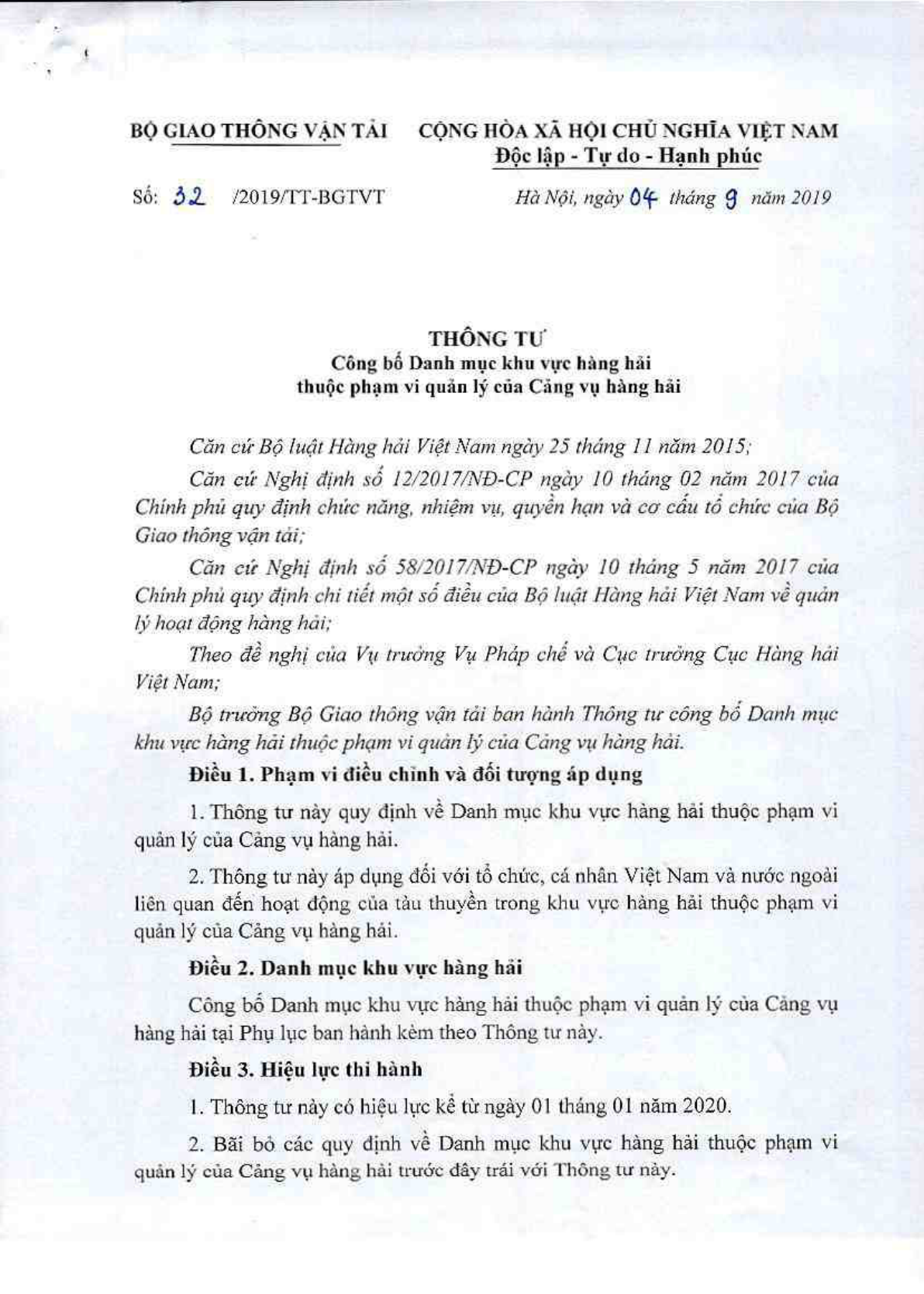 Thông tư 32/2019/TT-BGTVT của Bộ Giao thông Vận tải về việc công bố Danh mục khu vực hàng hải thuộc phạm vi quản lý của Cảng vụ hàng hải.