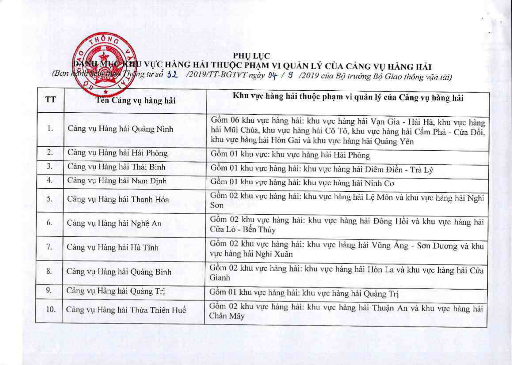 Ngày 04/9/2019, Bộ Giao thông Vận tải ban hành Thông tư 32/2019/TT-BGTVT về việc công bố Danh mục khu vực hàng hải thuộc phạm vi quản lý của Cảng vụ hàng hải.