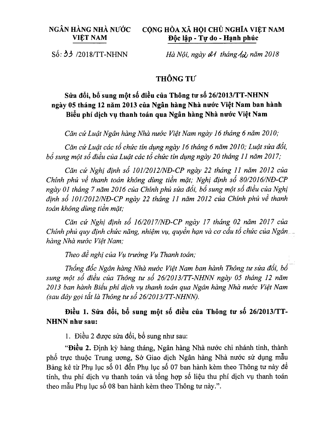Thông tư 33/2018/TT-NHNN của Ngân hàng Nhà nước Việt Nam về việc sửa đổi, bổ sung một số điều của Thông tư 26/2013/TT-NHNN ngày 05/12/2013 của Ngân hàng Nhà nước Việt Nam ban hành Biểu phí dịch vụ thanh toán qua Ngân hàng Nhà nước Việt Nam.