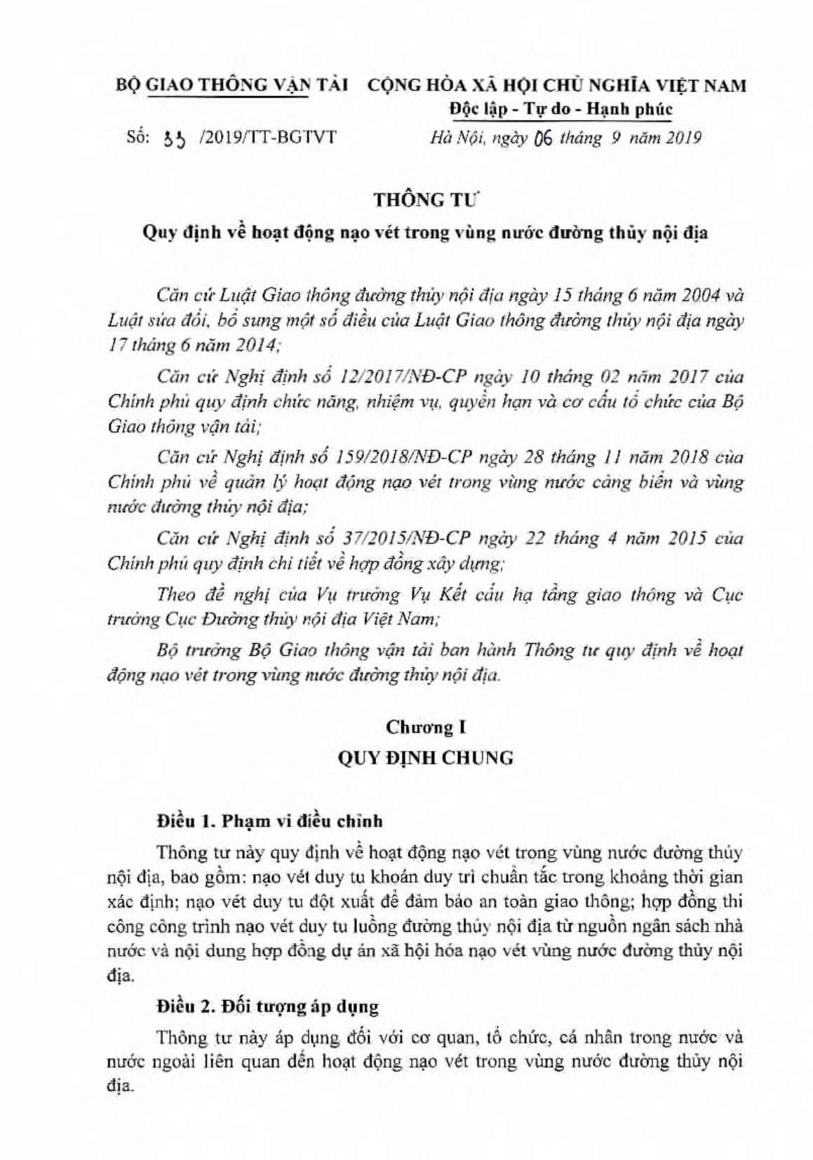 Thông tư 33/2019/TT-BGTVT quy định về hoạt động nạo vét trong vùng nước đường thủy nội địa do bộ giao thông vận tải ban hành.