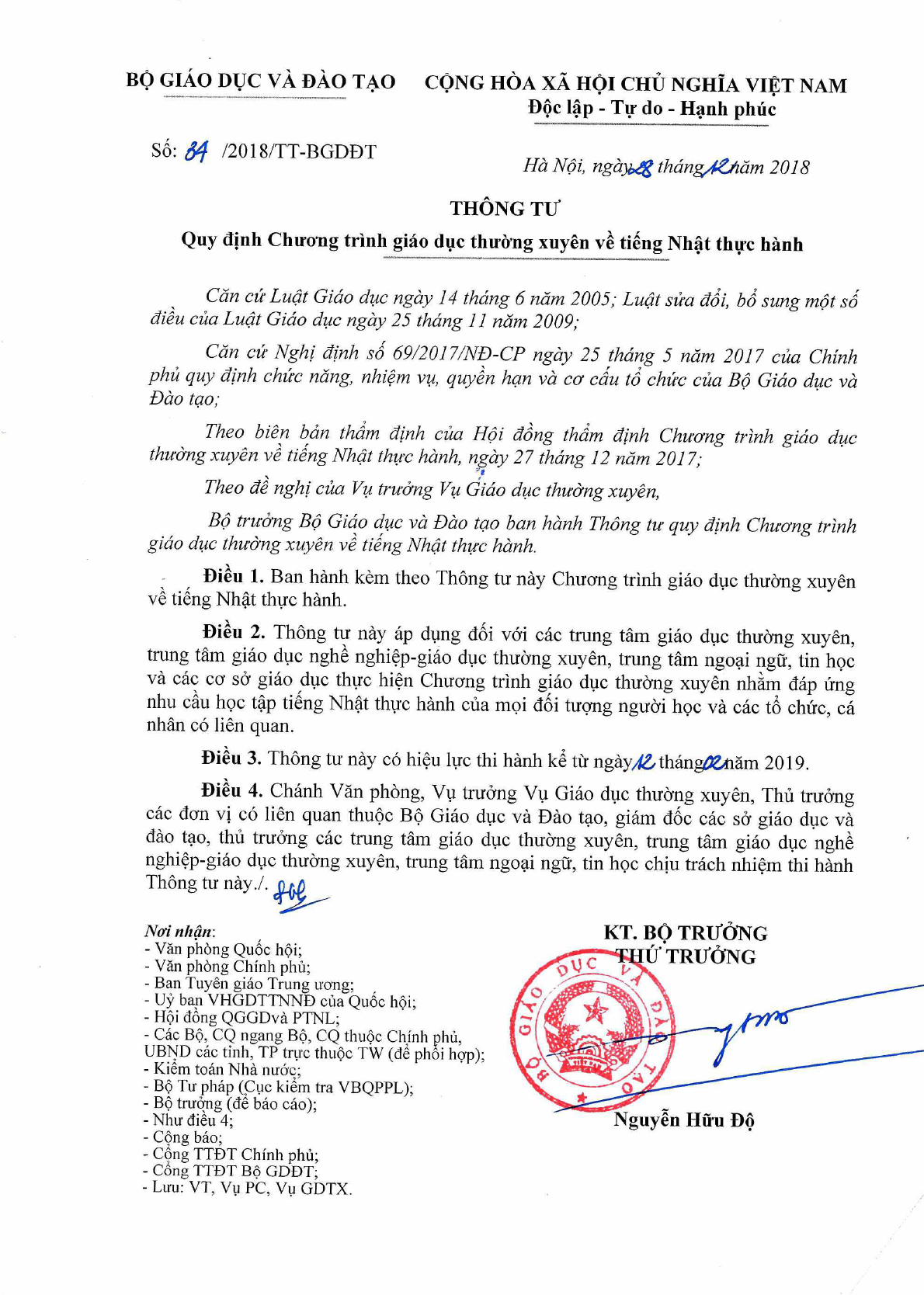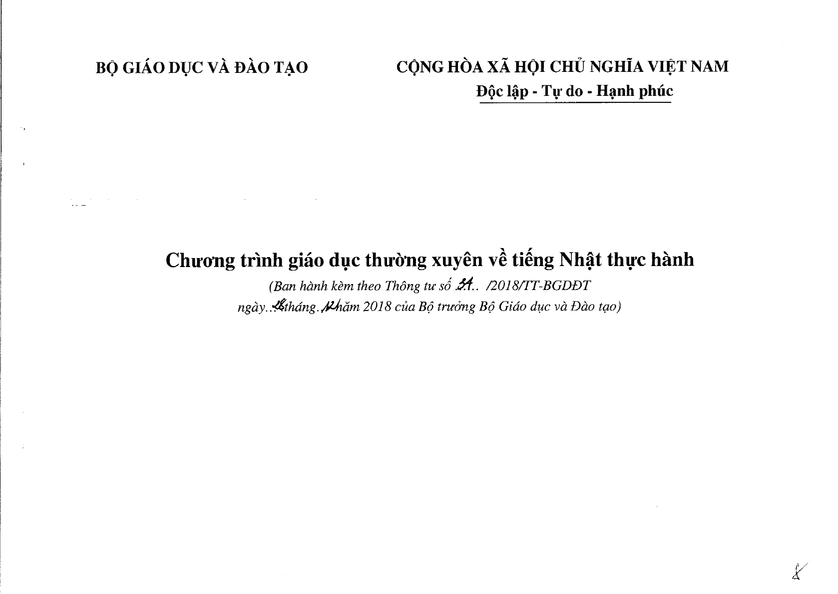 Thông tư 34/2018/TT-BGDĐT của Bộ Giáo dục và Đào tạo về việc quy định Chương trình giáo dục thường xuyên về tiếng Nhật thực hành.