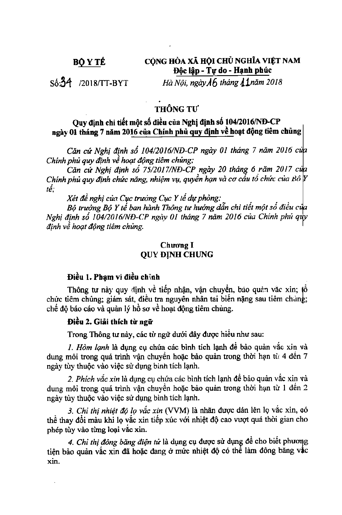 Thông tư 34/2018/TT-BYT của Bộ Y tế về việc quy định chi tiết một số điều của Nghị định 104/2016/NĐ-CP ngày 01/07/2016 của Chính phủ quy định về hoạt động tiêm chủng.