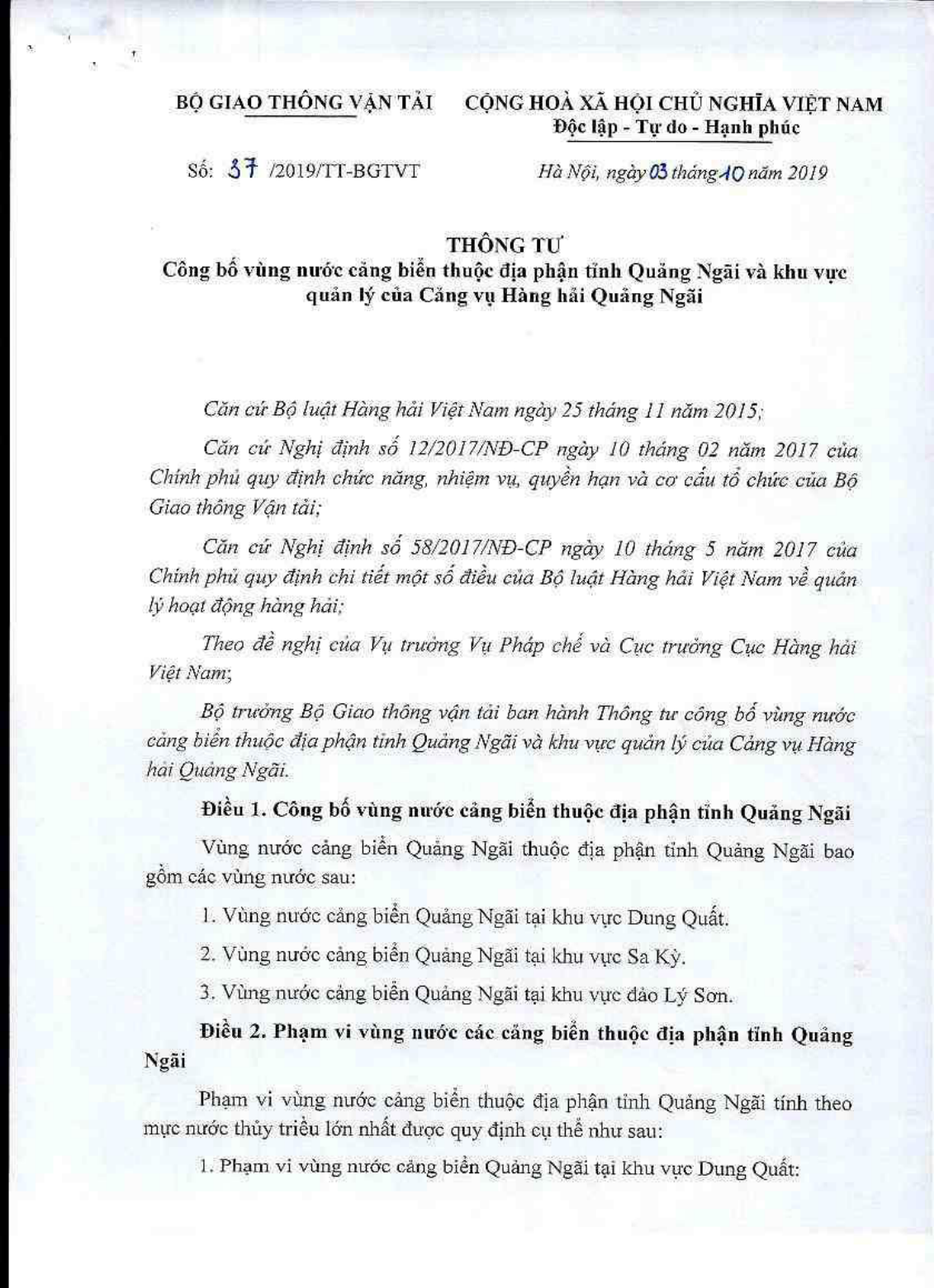 Thông tư 37/2019/TT-BGTVT của Bộ Giao thông Vận tải về việc công bố vùng nước cảng biển thuộc địa phận tỉnh Quảng Ngãi và khu vực quản lý của Cảng vụ Hàng hải Quảng Ngãi.