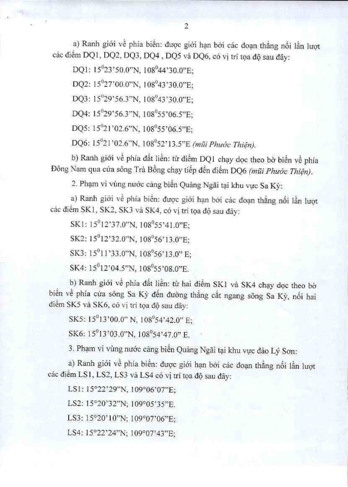Trong đó, phạm vi vùng nước cảng biển thuộc địa phận tỉnh Quảng Ngãi tính theo mực nước thủy triều lớn nhất tại khu vực Dung Quất ở ranh giới về phía biển được giới hạn bởi các đoạn thẳng nối lần lượt các điểm DQ1, DQ2, DQ3, DQ4, DQ5 và DQ6; Ranh giới về phía đất liền từ điểm DQ1 chạy dọc theo bờ biển về phía Đông Nam qua cửa sông Trà Bồng chạy tiếp đến điểm DQ6 (mũi Phước Thiện).