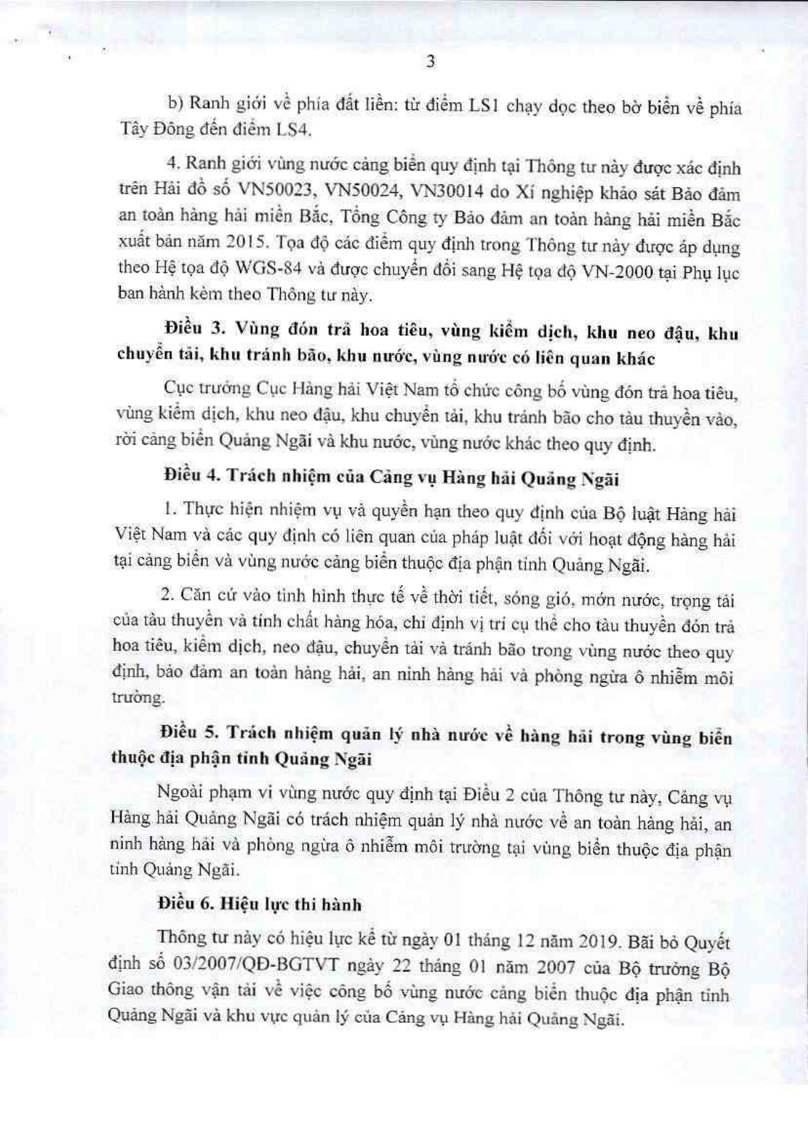 Thông tư 37/2019/TT-BGTVT về việc công bố vùng nước cảng biển thuộc địa phận tỉnh Quảng Ngãi và khu vực quản lý của Cảng vụ Hàng hải Quảng Ngãi được Bộ Giao thông Vận tải ban hành ngày 03/10/2019. Cụ thể, vùng nước cảng biển Quảng Ngãi thuộc địa phận tỉnh Quảng Ngãi bao gồm các vùng nước sau: Vùng nước cảng biển Quảng Ngãi tại khu vực Dung Quất; Vùng nước cảng biển Quảng Ngãi tại khu vực Sa Kỳ; Vùng nước cảng biển Quảng Ngãi tại khu vực đảo Lý Sơn.