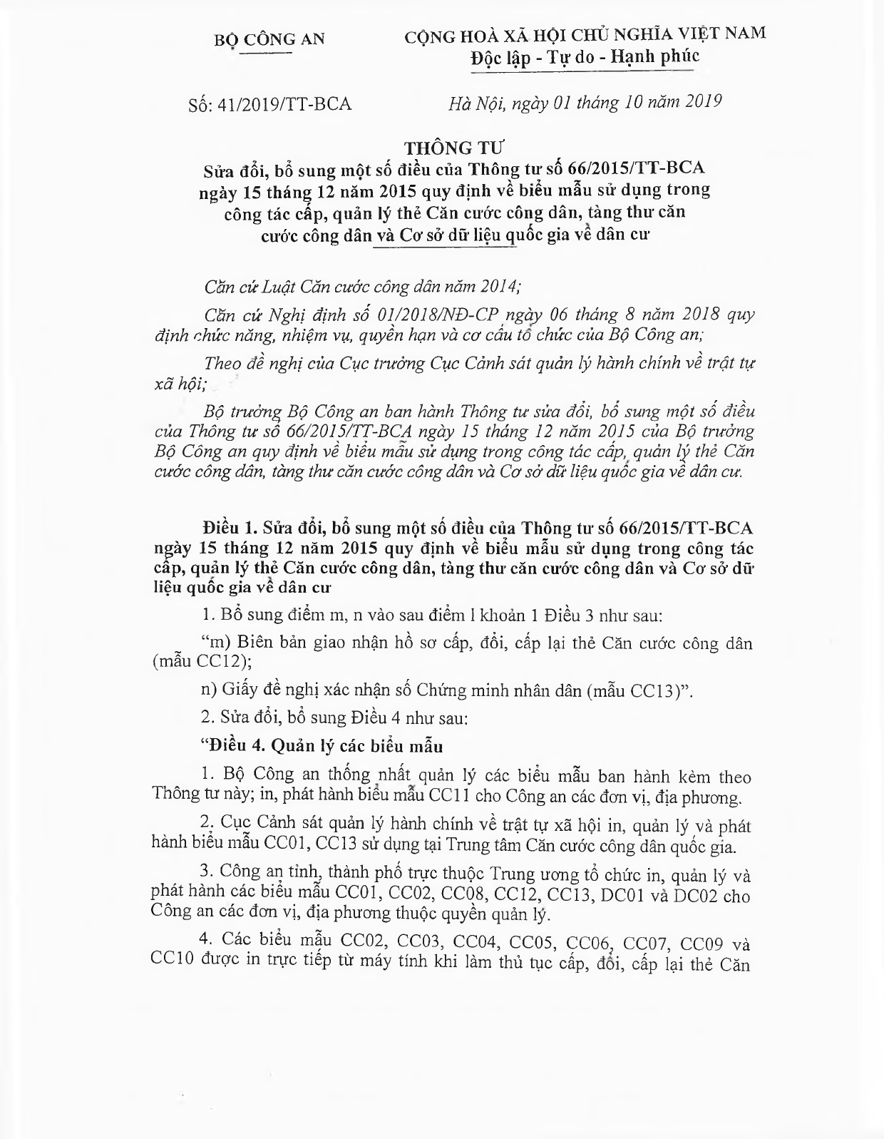 Thông tư 41/2019/TT-BCA sửa đổi Thông tư 66/2015/TT-BCA về biểu mẫu sử dụng trong công tác cấp, quản lý thẻ Căn cước công dân, tàng thư căn cước công dân và Cơ sở dữ liệu quốc gia về dân cư.