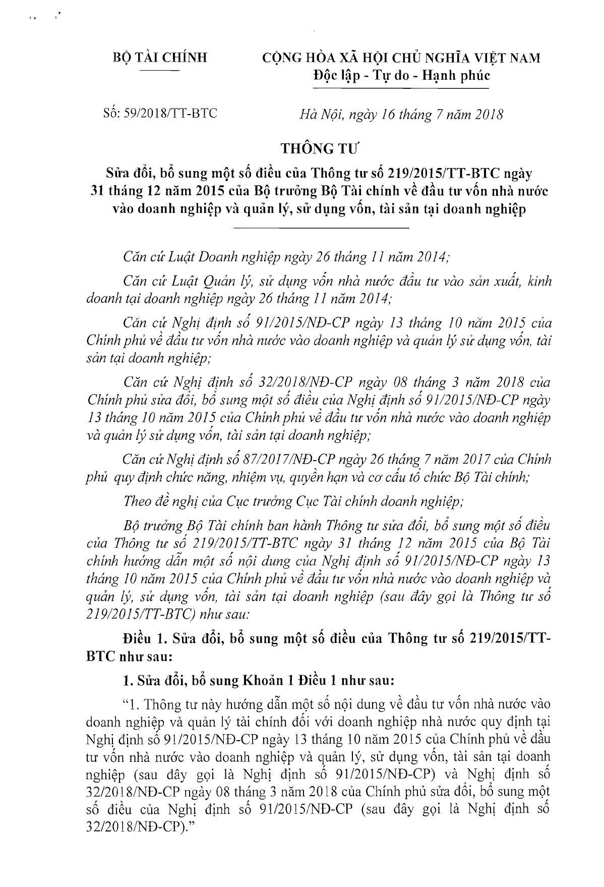 Thông tư 59/2018/TT-BTC sửa đổi thông tư 219/2015/TT-BTC về đầu tư vốn nhà nước vào doanh nghiệp và quản lý, sử dụng vốn, tài sản tại doanh nghiệp do Bộ trưởng Bộ Tài Chính ban hành. Để nắm rõ nội dung thông tư 59/2018/TT-BTC mời các bạn tải thông tư trong bài viết này của VnDoc.