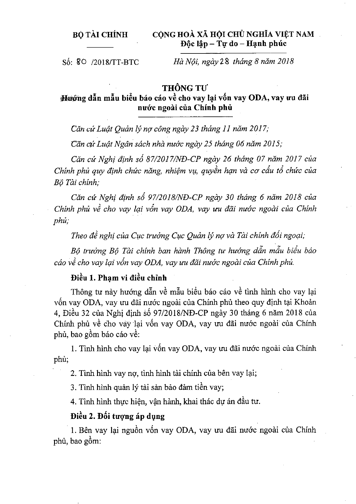 Thông tư 80/2018/TT-BTC hướng dẫn mẫu biểu báo cáo về cho vay lại vốn vay ODA, vay ưu đãi nước ngoài của chính phủ do bộ trưởng bộ tài chính ban hành. Thông tư sẽ bắt đầu có hiệu lực từ ngày 1/11/2018.