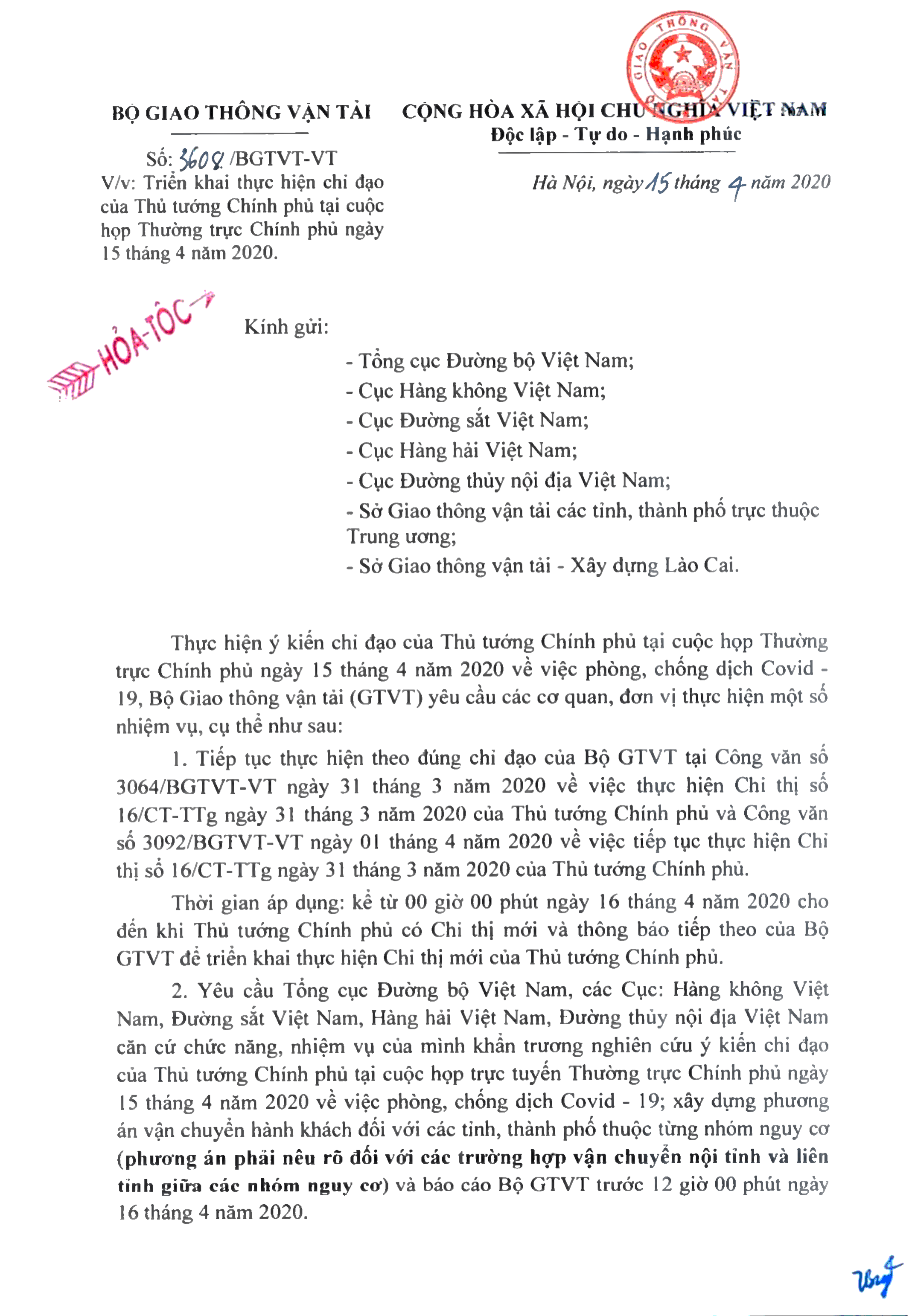 Bộ yêu cầu Tổng cục Đường bộ VN, các Cục: Hàng không VN, Đường sắt VN, Hàng hải VN, Đường thủy nội địa VN khẩn trương nghiên cứu ý kiến chỉ đạo của Thủ tướng tại cuộc họp trực tuyến Thường trực Chính phủ ngày 15/4/2020; xây dựng phương án vận chuyển hành khách đối với các tỉnh, thành phố thuộc từng nhóm nguy cơ và báo cáo Bộ GTVT trước 12 giờ ngày 16/4/2020.