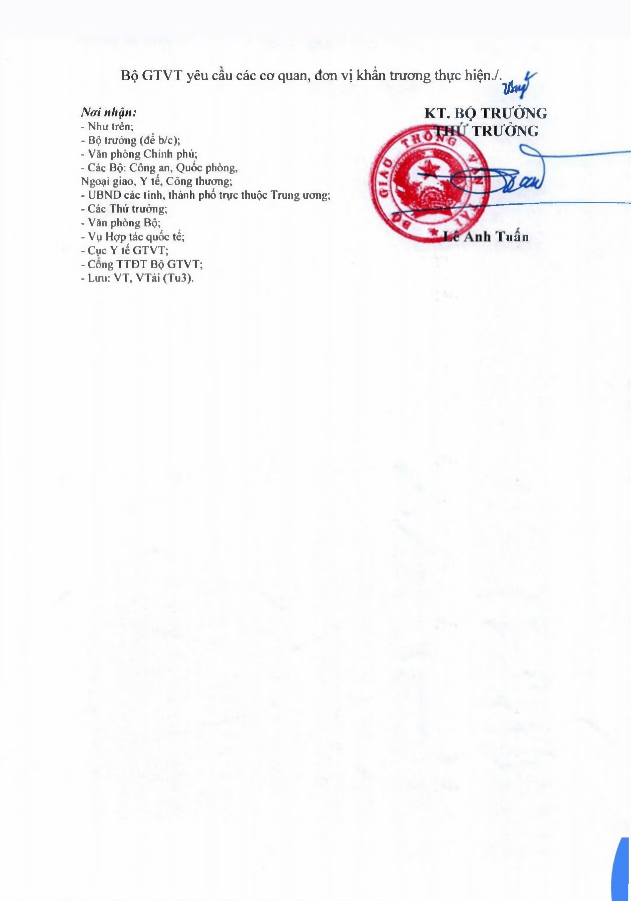 1. Tiếp tục thực hiện theo đúng chỉ do cùa B GTVT ti Công văn s